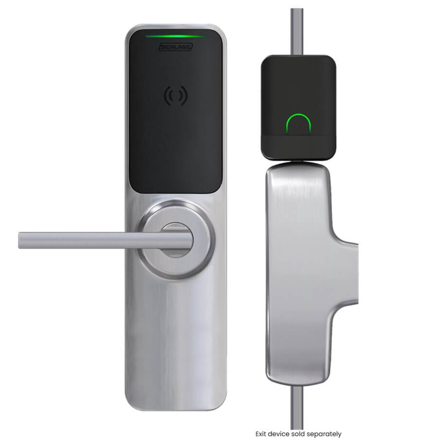 XE360 currently works within No-Tour or offline access control systems and supports the latest credential technologies, Including Mobile Credentials. Great Multifamily Common Area Access Solution. Schlage XE360 Exit Device Compatibility The XE360 exit trim is currently compatible with rim and surface vertical rod styles of the following exit devices: